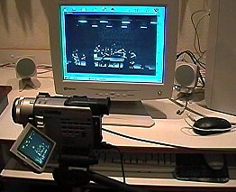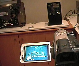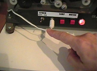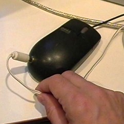 The Workprinter I use is made by Roger Evans of the company Moviestuff, and is shown on the left. Although it may look like a standard projector, it is actually much more. Connections with the computer are done via a special mouse, as shown below. The process works essentially as follows: (1) the projector advances the film, (2) the image is projected into the video camera, (3) the projector sends a signal to press the mouse button on the computer, and (4) the computer software captures the image and appends it onto the video file. The software used is called Cinecap.